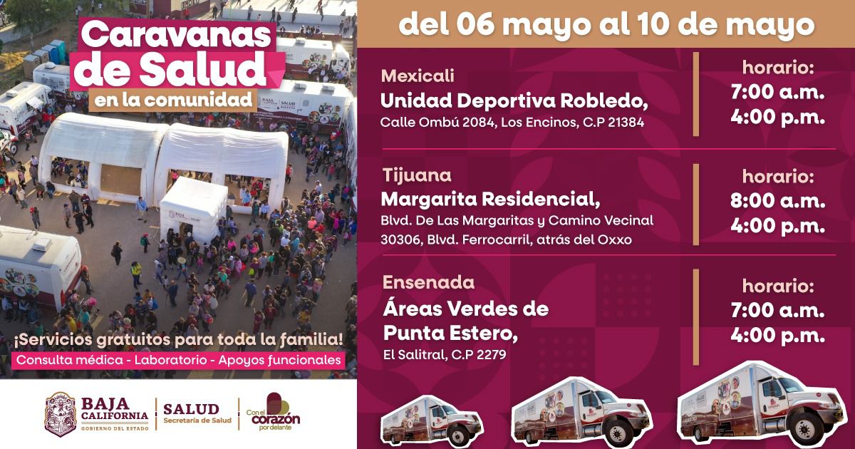 Baja California- Para continuar con la cobertura de localidades prioritarias en todos los municipios, los Centros de Salud Móviles de la Secretaría de Salud ofrecerán servicios en colonia Robledo de Mexicali, Margarita Residencial de Tijuana y El Salitral, en Ensenada.